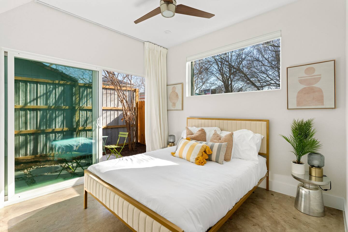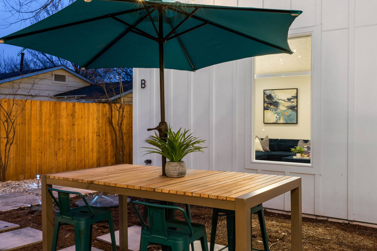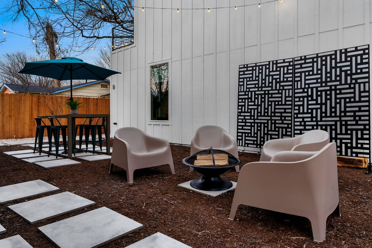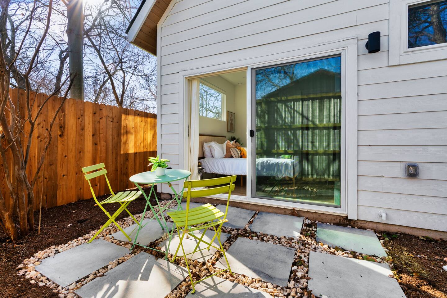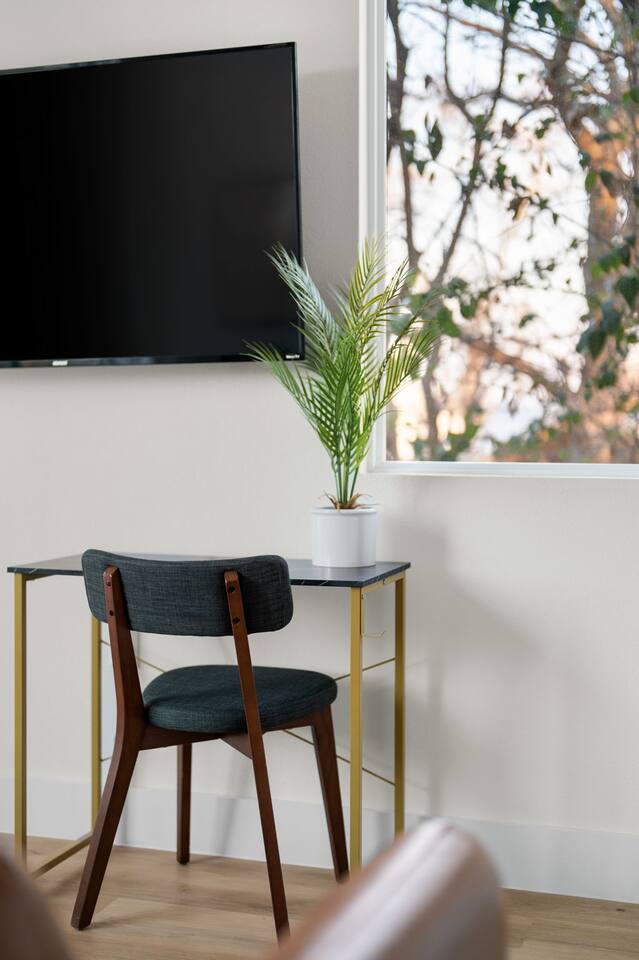 Each of our modern and comfortable rooms has its own private patio, complete with outdoor seating and a tranquil atmosphere. Take in the fresh air and enjoy a cup of coffee in the morning, or relax with a glass of wine in the evening. Or step outside to the private backyard and enjoy a night by the fire pit, roasting marshmallows and stargazing. You can also take advantage of the outdoor dining table and enjoy a meal al fresco with friends and family. Please note that while our home shares a backyard with Unit A house in front, we assure you that there is no other shared space or amenities. At the end of the day, retire to one of the comfortable bedrooms, each with its own plush bed and soft linens. The modern bathroom features a shower and all the essentials you need for a comfortable stay. Whether you're here for work or play, you'll love the peacefulness and serenity of this charming space.