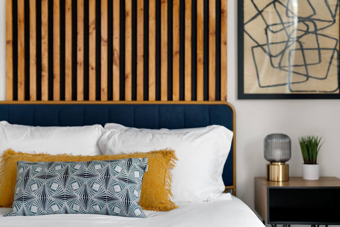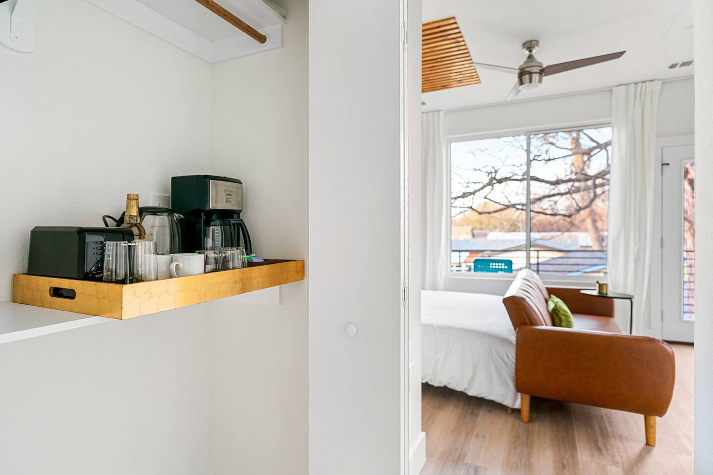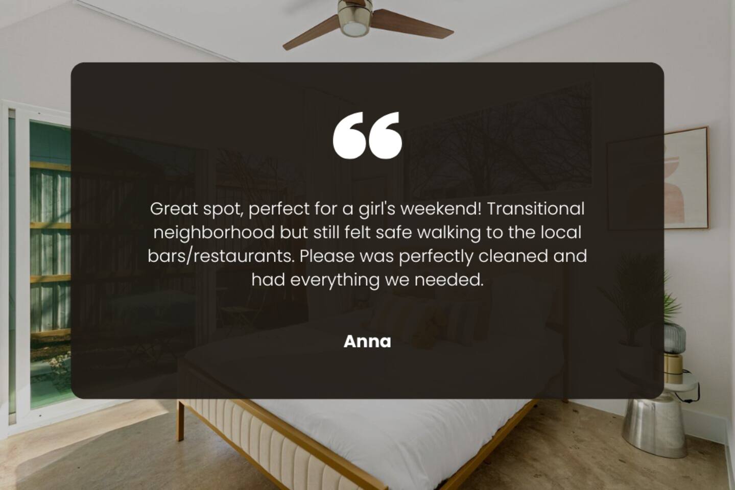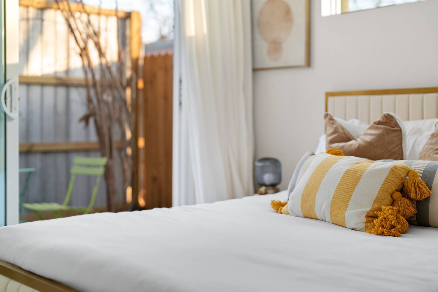 Each of our modern and comfortable rooms has its own private patio, complete with outdoor seating and a tranquil atmosphere. Take in the fresh air and enjoy a cup of coffee in the morning, or relax with a glass of wine in the evening. Or step outside to the private backyard and enjoy a night by the fire pit, roasting marshmallows and stargazing. You can also take advantage of the outdoor dining table and enjoy a meal al fresco with friends and family. Please note that while our home shares a backyard with Unit A house in front, we assure you that there is no other shared space or amenities. At the end of the day, retire to one of the comfortable bedrooms, each with its own plush bed and soft linens. The modern bathroom features a shower and all the essentials you need for a comfortable stay. Whether you're here for work or play, you'll love the peacefulness and serenity of this charming space.
